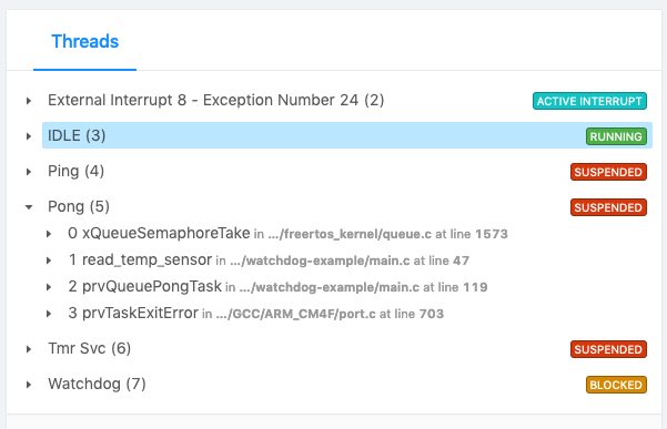 If your debugger is FreeRTOS thread aware, you can switch to this thread to view the backtrace. Alternatively you can use a tool like Memfault (Disclosure: the author is founder & CTO at Memfault) to extract the data and run the analysis in the cloud. Let’s try that out.