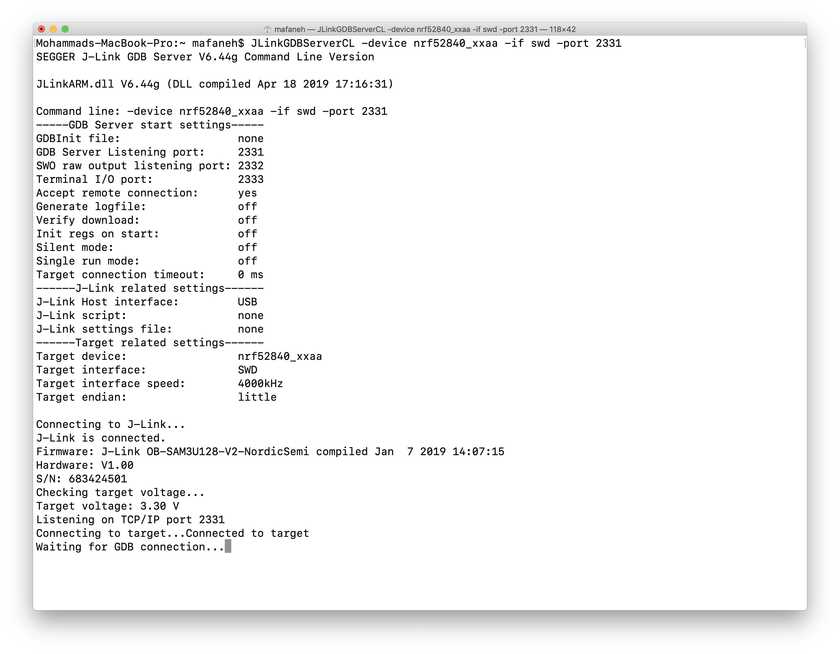 $ JLinkGDBServerCL -device nrf52840_xxaa -if swd -port 2331