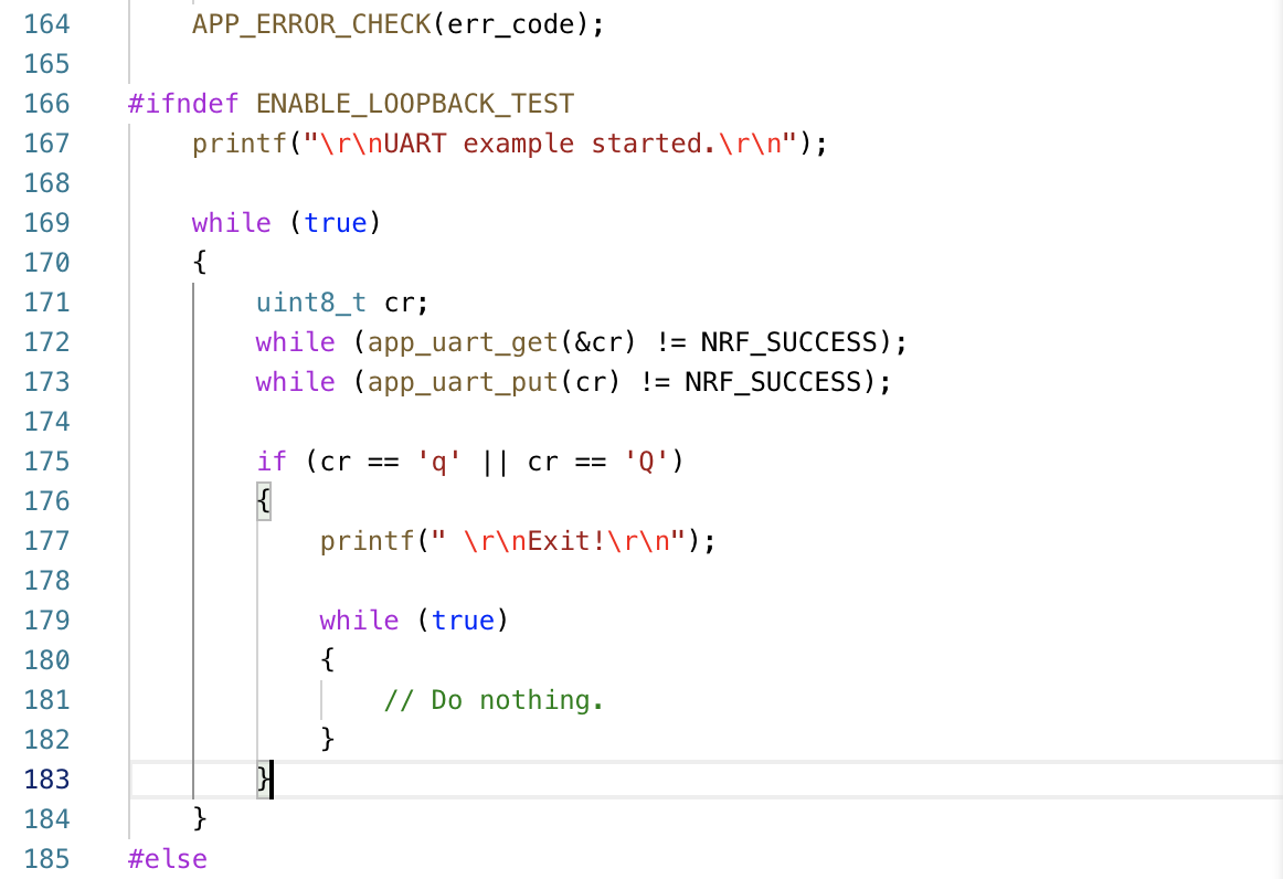 In our example program, the code in main.c at line 175 checks the character sent from the UART to see if it matches the q or Q character: